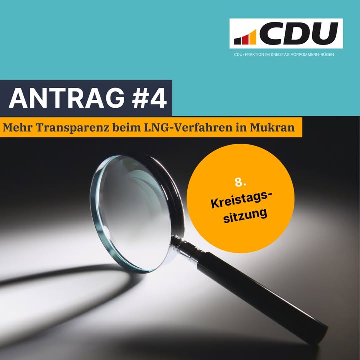 ⚓ Antrag# 4: Mehr Transparenz beim LNG-Verfahren in MukranBeim LNG-Projekt in Mukran stehen viele Fragen im Raum ? für Anwohnerinnen und Anwohner, für Kommunalpolitik und für die Wirtschaft vor Ort.Mit unserem gemeinsamen Antrag mit der Fraktion BfS/FDP/VR+ fordern wir deshalb konsequente Transparenz und eine echte Beteiligung der Öffentlichkeit.Unsere zentralen Punkte:🔍 Offenlegung aller relevanten Unterlagen durch StALU und Ministerium🗣️ Veröffentlichung der ReGas-Unterlagen und klare rechtliche Einordnung⚡ Klärung der ursprünglich zugesagten Landstrom- und KWK-Lösung📄 Stellungnahme des Landes zur von ReGas eingereichten Klage🏛️ Öffentliche Anhörung ? mit Beteiligung von ReGas➡️ Warum das wichtig ist:- Planungssicherheit für die Region- Vertrauensbildung gegenüber Bürgerinnen und Bürgern- Schutz der Tourismus- und Naturregion Rügen- Ein faires, rechtssicheres Verfahren ohne Hinterzimmer-EntscheidungenFür uns ist klar:Große Projekte brauchen Transparenz ? erst recht dort, wo Region, Umwelt und Zukunft unserer Insel betroffen sind.#CDUFraktionVR #LNG #Mukran #Transparenz #Rügen #Kommunalpolitik #Energie #Bürgerbeteiligung