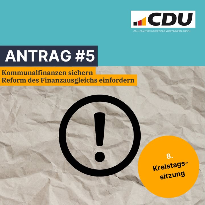 mehrAntrag #5: Kommunalfinanzen sichern ? Reform des Finanzausgleichs einfordernStädte, Gemeinden und Landkreise stehen finanziell unter Druck: steigende Sozialausgaben, wachsende Aufgaben, begrenzte eigene Einnahmen. Mit unserem Antrag, den wir zusammen mit der Fraktion BfS/FDP/VR+ einbringen, fordern wir das Land Mecklenburg-Vorpommern auf, den kommunalen Finanzausgleich endlich nachhaltig zu reformieren.Unsere Kernforderungen:💰 Reduzierung kommunaler Soziallasten ? das Land muss stärkere Verantwortung übernehmen📊 Reform des Finanzausgleichsgesetzes (FAG) ? fair, transparent, zukunftsfähig📈 Stabilisierung oder Erhöhung der Finanzausgleichsmasse ab 2026🏗️ Wiederaufstockung der Infrastrukturpauschale auf 150 Millionen Euro➡️ Warum das wichtig ist:- Kommunen brauchen verlässliche Einnahmen, um Schulen, Straßen, Kitas, Feuerwehren & soziale Einrichtungen zu finanzieren- Planungssicherheit schafft Investitionen vor Ort- Ohne solide Finanzen sind weder Digitalisierung noch Mobilität oder Daseinsvorsorge leistbar- Handlungsfähigkeit der Kommunen ist Grundlage für Demokratie und TeilhabeUnsere Botschaft ist klar:Starke Kommunen brauchen starke Finanzen ? dafür setzen wir uns ein.#CDUFraktionVR #Finanzen #Kommunalfinanzen #FAG #Landkreise #Kommunen #Daseinsvorsorge #VorpommernRügen #Kommunalpolitik