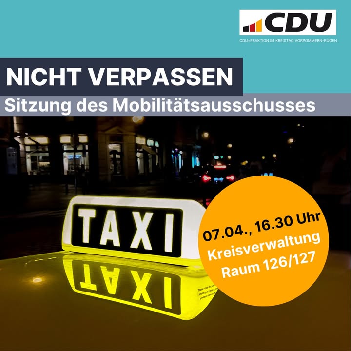 📌 Mobilitätsausschuss tagt am 7. AprilAm Dienstag, den 7. April 2026, kommt der Mobilitätsausschuss des Landkreises Vorpommern-Rügen in Stralsund zusammen. Gerade beim Thema Mobilität geht es um konkrete Alltagsfragen ? vom Nahverkehr bis zur Erreichbarkeit im ländlichen Raum.Deshalb auf der Tagesordnung:🚕 Folgegutachten zum TaxigewerbeVorstellung eines Gutachtens zur Funktionsfähigkeit des Taxigewerbes inklusive Tarifanalyse im Landkreis.➡️ Unser Ziel:Praktische Lösungen für eine verlässliche und bezahlbare Mobilität im gesamten Landkreis.#VorpommernRügen #Mobilität #Ausschuss #Taxi #ÖPNV #Kreistag #CDUFraktion