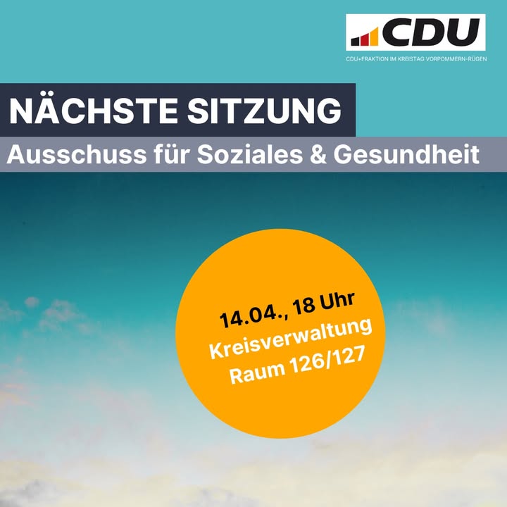 mehr📌 Ausschuss für Soziales und Gesundheit Am Dienstag, den 14. April 2026, findet die Sitzung des Ausschusses für Soziales und Gesundheit statt.Auf der Tagesordnung:👶 Geburtshilfe im LandkreisBericht zur Erprobungsphase der Hebammen.🦠 Infektionsgeschehen im LandkreisAktueller Sachstand zur Entwicklung von Infektionskrankheiten.👩⚖️ GleichstellungVorstellung der Aufgaben und Arbeit der Gleichstellungsbeauftragten.🗣️ EinwohnerfragestundeRaum für Anliegen und Fragen aus der Bevölkerung.Gerade im sozialen und gesundheitlichen Bereich geht es um konkrete Lebensrealitäten der Menschen vor Ort ? von medizinischer Versorgung bis zu gesellschaftlicher Teilhabe.➡️ Unser Ziel:Eine verlässliche Gesundheitsversorgung und starke soziale Strukturen im Landkreis sichern und weiterentwickeln.#VorpommernRügen #Gesundheit #Soziales #Ausschuss #Kreistag #CDUFraktion