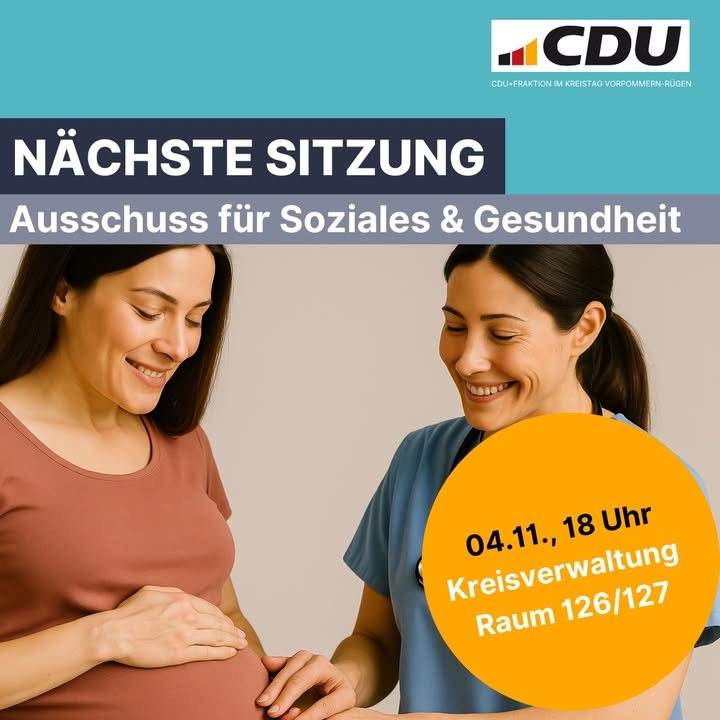 mehr🤝 Öffentliche Sitzung des Ausschusses für Soziales und GesundheitAm Dienstag, 4. November 2025, tagt der Ausschuss für Soziales und Gesundheit:📅 Dienstag, 4. November 2025🕕 18:00 Uhr📍 Kreisverwaltung Stralsund, Raum 126/127Themen der öffentlichen Sitzung u. a.:👩⚕️ Vorstellung der Integrationsbeauftragten Frau Frauke Schüler👶 Beratung zum Beschluss des Kreistages:"Erhalt der Geburtshilfe in Stralsund ? Solidarität mit den Beleghebammen"? Bericht der Arbeitsgruppe zur ärztlichen und zahnmedizinischen Versorgung im Landkreis📊 Beratung zur Haushaltssatzung 2026➡️ Diese Sitzung ist öffentlich. #CDUFraktionVR #Soziales #Gesundheit #Hebammen #Geburtshilfe #Integration #Daseinsvorsorge #VorpommernRügen