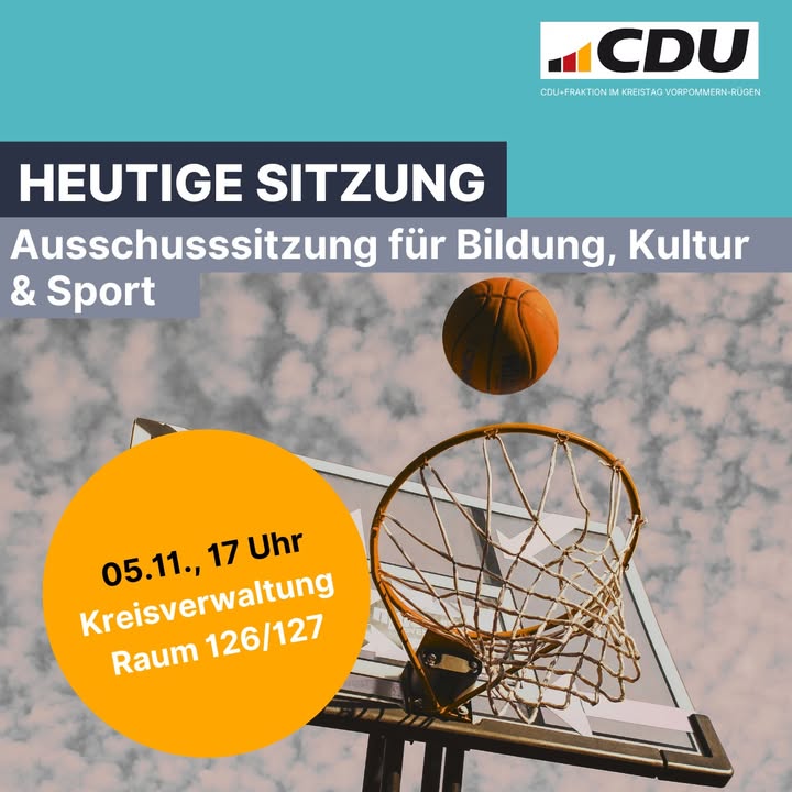 mehr🎓 Öffentliche Sitzung des Ausschusses für Bildung, Kultur und SportAm Mittwoch, 5. November 2025, kommt der Ausschuss für Bildung, Kultur und Sport des Landkreises Vorpommern-Rügen zusammen:📅 Mittwoch, 5. November 2025🕔 17:00 Uhr📍 Kreisverwaltung Stralsund, Raum 126/127Themen der öffentlichen Sitzung u. a.:📊 Beratung zur Haushaltssatzung 2026🗓️ Sitzungstermine 2026 ? Abstimmung und Planung#CDUFraktionVR #Bildung #Kultur #Sport #Kommunalpolitik #VorpommernRügen #Transparenz #Kreistag #LandkreisVR