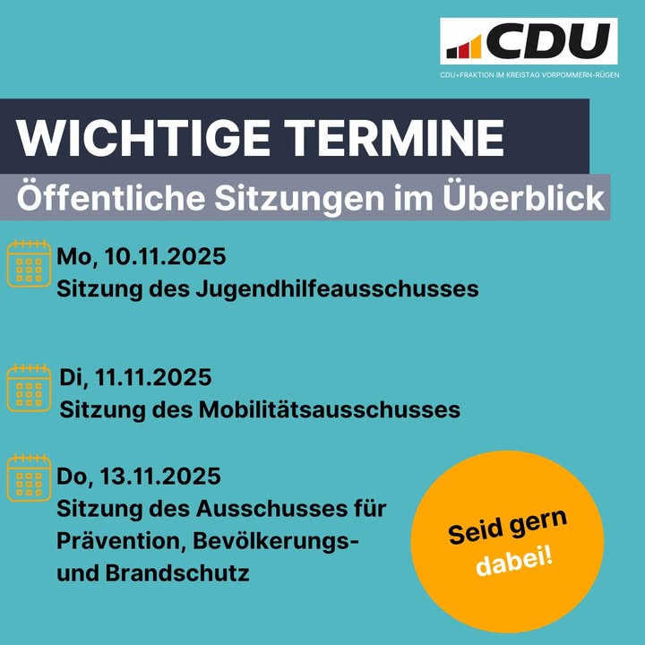 mehr🗓️ Öffentliche Sitzungen in der kommenden WocheIn der kommenden Woche stehen wieder wichtige Themen in den Ausschüssen des Landkreises Vorpommern-Rügen auf der Tagesordnung:📅 Montag, 10. November 2025👧 10. Sitzung des Jugendhilfeausschusses📅 Dienstag, 11. November 2025🚗 7. Sitzung des Mobilitätsausschusses📅 Donnerstag, 13. November 2025🔥 7. Sitzung des Ausschusses für Prävention, Bevölkerungs- und Brandschutz🔗 Weitere Informationen und Tagesordnungen:https://ris.kreis-vr.de/sessionnet/bi_vr/info.php#CDUFraktionVR #Kreistag #Kommunalpolitik #VorpommernRügen #Transparenz #Jugendhilfe #Mobilität #Brandschutz #Feuerwehr