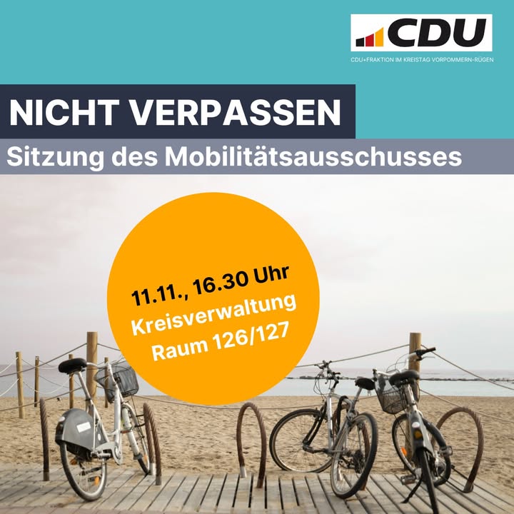 mehr🚗 Öffentliche Sitzung des MobilitätsausschussesAm Dienstag, 11. November 2025, berät sich der Mobilitätsausschuss des Landkreises Vorpommern-Rügen:📅 Dienstag, 11. November 2025🕓 16:30 Uhr📍 Kreisverwaltung Stralsund, Raum 126/127zu folgenden Themen:🚧 Präsentation des ganzheitlichen Konzeptes für die Nehrung Schaabe zur Optimierung der Verkehrssituation🚴♂️ Vorstellung des neuen Wegekonzepts mit Fokus auf Radfahrschutzstreifen🛣️ Bau- und Planungsarbeiten an den Kreisstraßen im Landkreis Vorpommern-Rügen🚌 Deutschlandticket als Höchsttarif im ÖPNV 2026📊 Haushaltssatzung 2026➡️ Die Sitzung ist öffentlich. #CDUFraktionVR #Mobilität #Verkehr #ÖPNV #Infrastruktur #VorpommernRügen #Kommunalpolitik
