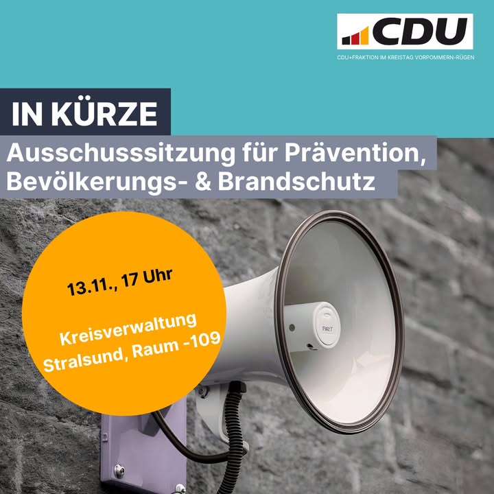 Öffentliche Sitzung des Ausschusses für Prävention, Bevölkerungs- und BrandschutzAm Donnerstag, 13. November 2025, kommt der Ausschuss für Prävention, Bevölkerungs- und Brandschutz unter Leitung von Christian Griwahn (CDU-Fraktion) zusammen:📅 Donnerstag, 13. November 2025🕔 17:00 Uhr📍 Kreisverwaltung Stralsund, Raum -109 (Kellergeschoss), Carl-Heydemann-Ring 67Und das steht auf der Tagesordnung: 💰 Vergabe der Pauschalzuweisung aus der Feuerschutzsteuer ? Unterstützung für Investitionen der Gemeinden in den Brandschutz🌡️ Aktueller Sachstand Gefahrenabwehr ? Umsetzung von Projekten wie Leuchttürme und Wärmeinseln im Landkreis📊 Beratung zur Haushaltssatzung 2026➡️ Politik zum Anfassen ? kommt gern vorbei, um zu erfahren, wie kommunale Entscheidungen entstehen.#CDUFraktionVR #Brandschutz #Feuerwehr #Katastrophenschutz #Prävention #VorpommernRügen #Kommunalpolitik