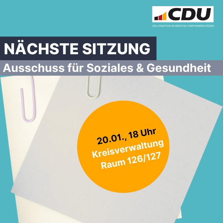 ? Ausschuss für Soziales und GesundheitSoziale und gesundheitliche Themen betreffen viele Menschen im Landkreis.Darüber berät der Ausschuss für Soziales und Gesundheit in seiner nächsten öffentlichen Sitzung:- die Umsetzung des Bußgeldkatalogs im Bereich der Gemeinschaftsunterkünfte- die Einwohnerfragestunde- aktuelle Berichte und Anfrage📅 Dienstag, 20. Januar 2026🕕 18:00 Uhr📍 Kreisverwaltung Stralsund, Raum 126/127Im öffentlichen Teil geht es um:➡️ Die Sitzung ist öffentlich. Ihr seid herzlich eingeladen, unsere Beratungen vor Ort zu verfolgen und Fragen einbringen. #CDUFraktionVR #Soziales #Gesundheit #Ausschussarbeit #Kreistag #VorpommernRügen #Stralsund #cduvr